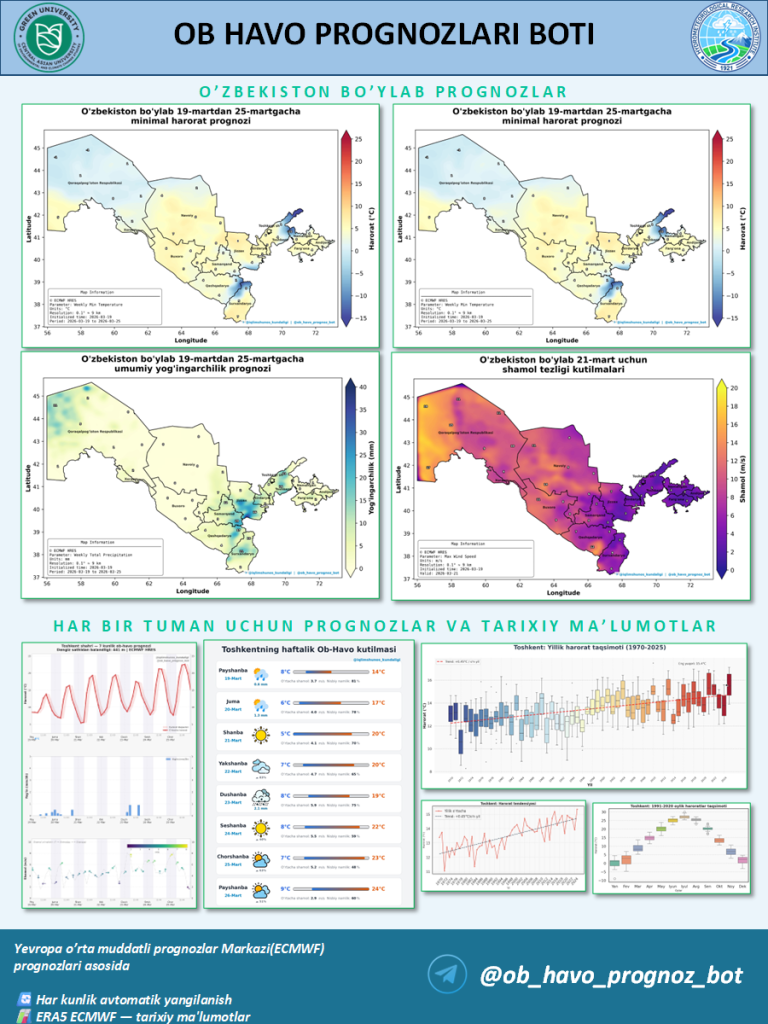 The Telegram bot @ob_havo_prognoz_bot enables users to receive accurate and up-to-date weather information in a convenient format. It is developed based on data from the European Centre for Medium-Range Weather Forecasts (ECMWF) and provides reliable short-term forecasts tailored to the user’s location.